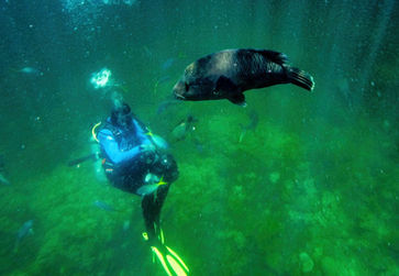 A Humphead or Maori Wrasse, one of the largest fish on the Great Barrier Reef, visits a scuba diver.